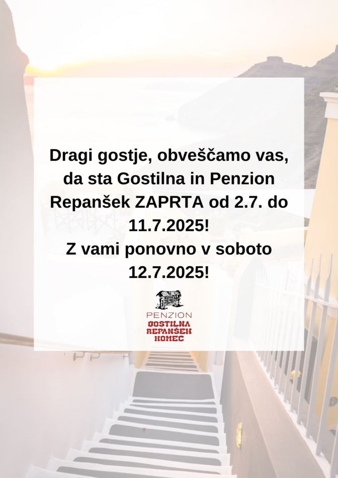 Obveščamo vas, da sta Gostilna in Penzion Repanšek zaprta od 2. do 11. julija 2025.Z veseljem vas znova pričakujemo v soboto, 12. julija! 🌞🍽️