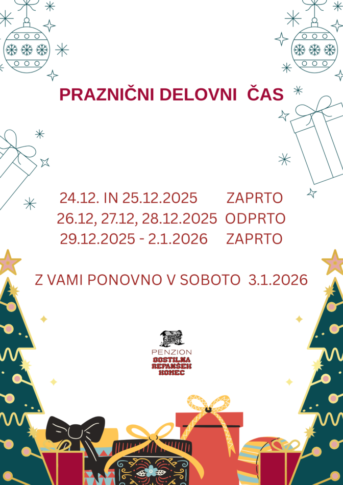 Dragi gostje,kolektiv Gostilne in Penziona Repanšek vam želi lepe in mirne praznike ter srečno in zdravo novo leto. Delovni čas v prazničnem času: 24. 12. in 25. 12. 2025: ZAPRTO 26. 12., 27. 12. in 28. 12. 2025: ODPRTO 29. … Read More