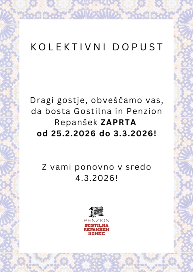 Dragi gostje, obveščamo vas, da bosta Gostilna in Penzion Repanšek ZAPRTA od 25.2.2026 do 3.3.2026! Z vami ponovno v sredo 4.3.2026! Hvala za razumevanje! Kolektiv Repanšek